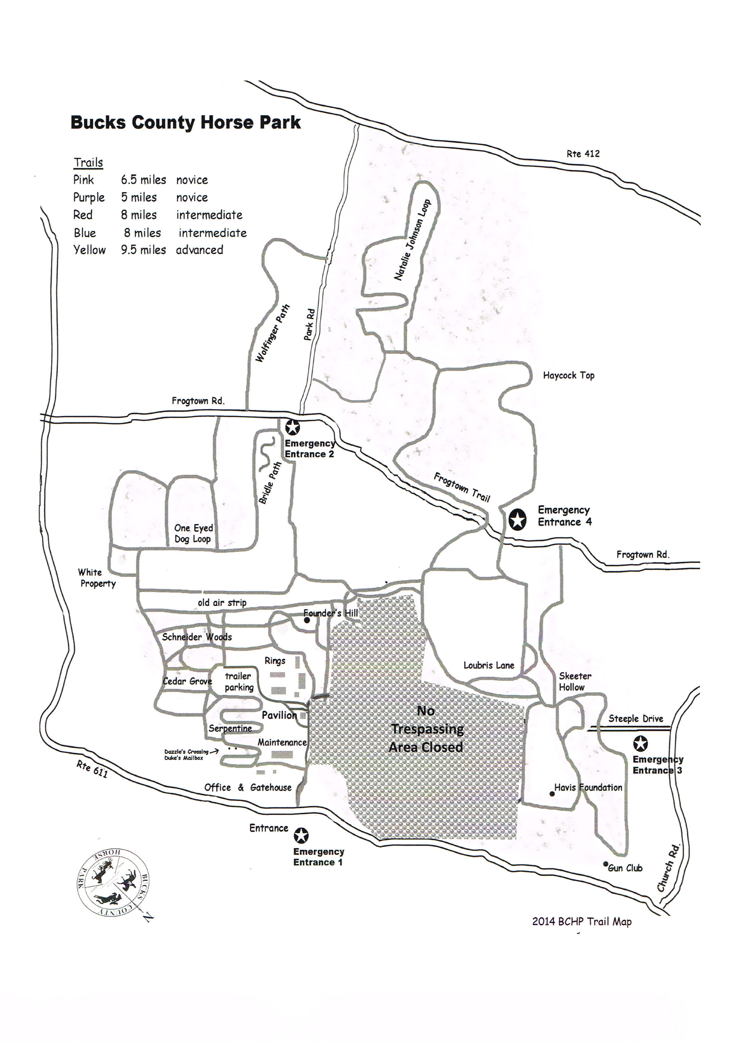 The trail system at Bucks County Horse Park uniquely sets us apart from other horse parks in the northeast. Only at BCHP can one hack into the woods, gallop down a former airstrip, forge across the end of a pond, and enjoy a leisurely walk up and down wooded hills. Trails originate on the main section of the Park property owned by the Bucks County Park and Recreation Department and meander through dedicated easements on private property as well as trails graciously lent to us by our neighbors.